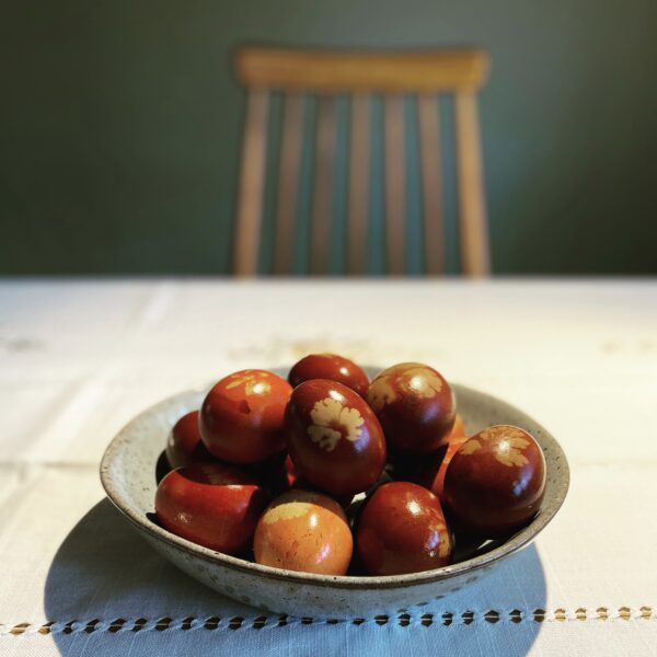 Tip: Voeg aan elk verfbad een flinke scheut azijn toe. Dit etst de schaal van het ei heel lichtjes, waardoor de natuurlijke pigmenten diep in de schaal kunnen trekken.